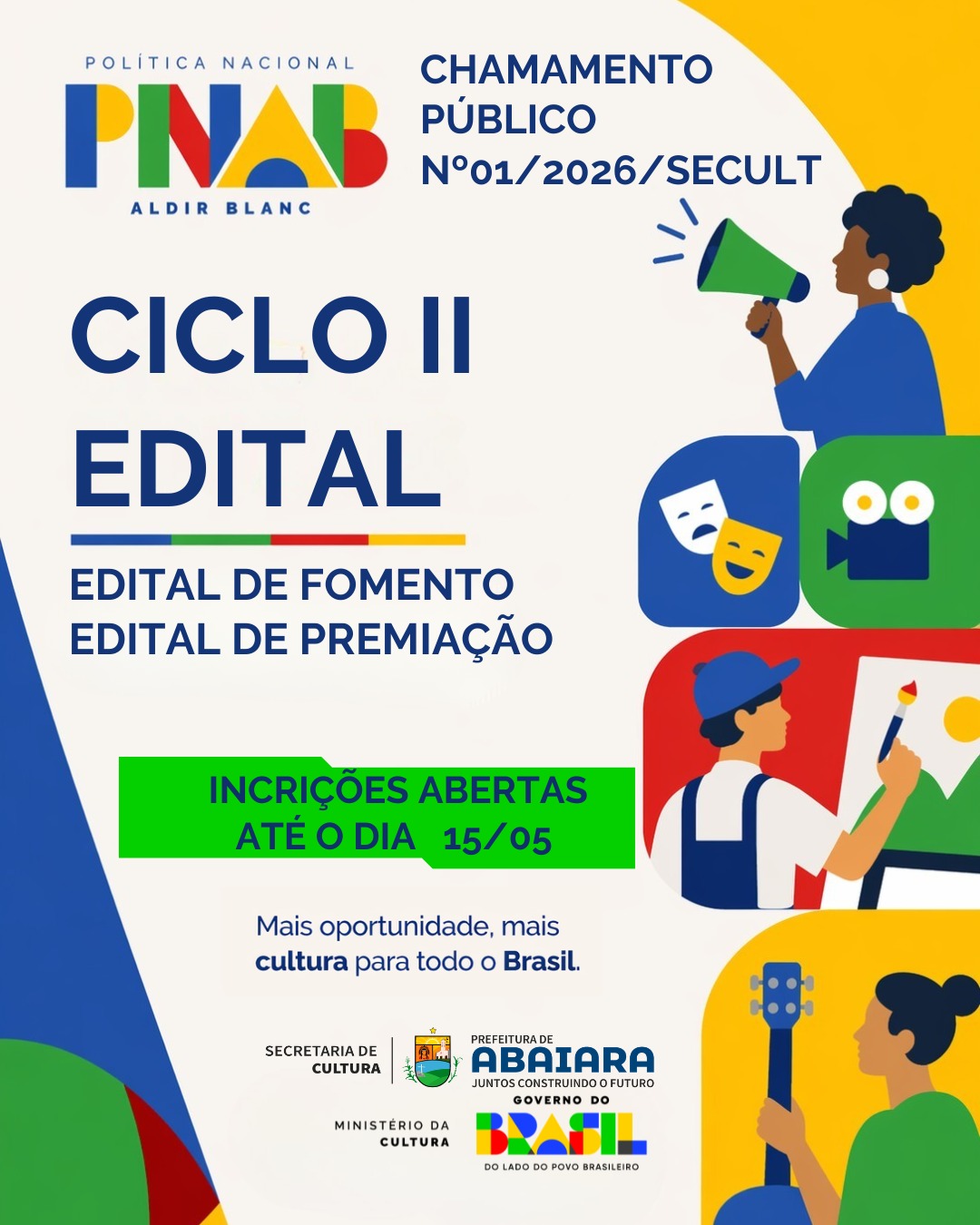 A Prefeitura Municipal de Abaiara, por meio da Secretaria Municipal de Cultura, torna públicos os Editais da Política Nacional Aldir Blanc de Fomento à Cultura – PNAB (Ciclo II).