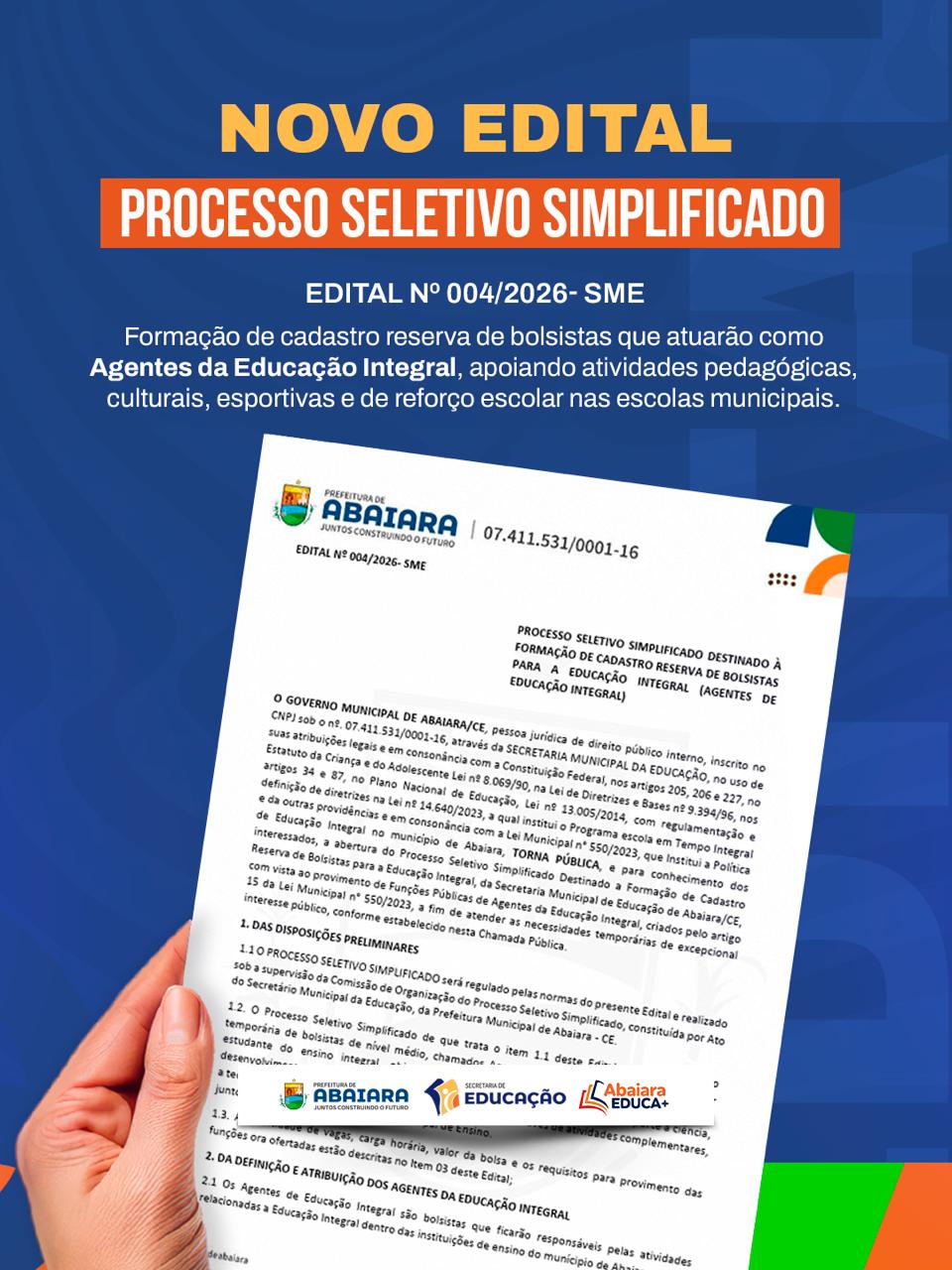 Clique para visualizar o PROCESSO SELETIVO SIMPLIFICADO – EDITAL Nº 004/2026 – SME